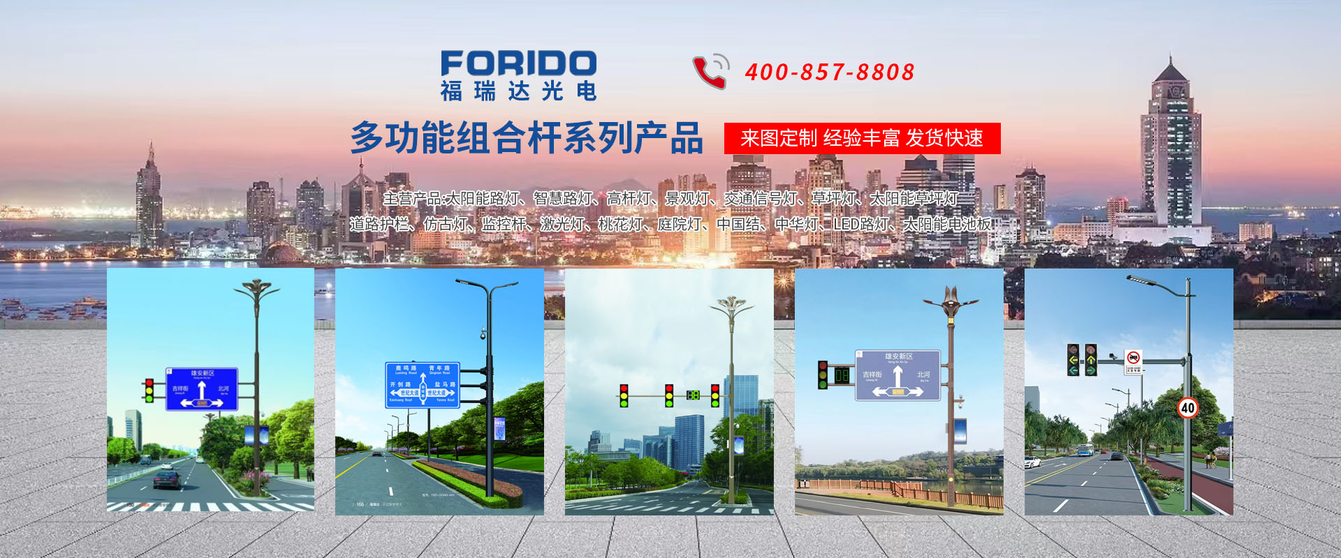 揚州福瑞達光電科技有限公司位于淮左名都歷史文化名城、中國路燈制造基地揚州市北郊菱塘工業(yè)園,公司占地面積76000平方米,注冊資金10518萬元,擁有高級技術嫻熟的員工280多人,擁有大型折彎機、激光切割、數控注塑機、壓鑄機、自動埋弧焊、氣焊、彩色粉末靜電噴塑等大型自動化設備,我公司是一家集設計、研發(fā)、生產、銷售、施工安裝服務為一體的戶外交通照明產品制造商,主要生產智慧路燈、太陽能路燈、LED路燈、高桿燈、景觀燈、交通信號燈、交通標志牌、通信鐵塔、路跨鋼結構、公交站臺、太陽能光伏組件、景點亮化、樓宇亮化工程的設計施工等。公司秉承開拓創(chuàng)新、銳意進取、精誠服務的企業(yè)精神,堅持以“誠信為本、技術為先、服務是金”的合作理念,我們憑借先進的制造工藝、優(yōu)質的產品質量、合理的市場價格和完善的售后服務贏得了廣闊的市場和客戶的信賴。 我公司已通過ISO9001質量體系認證、ISO14001環(huán)境管理體認證,CQC產品認證,中國節(jié)能產品認證,通過“CCC”強制性產品認證,具有市政總承包,照明,交安,設計等資質···